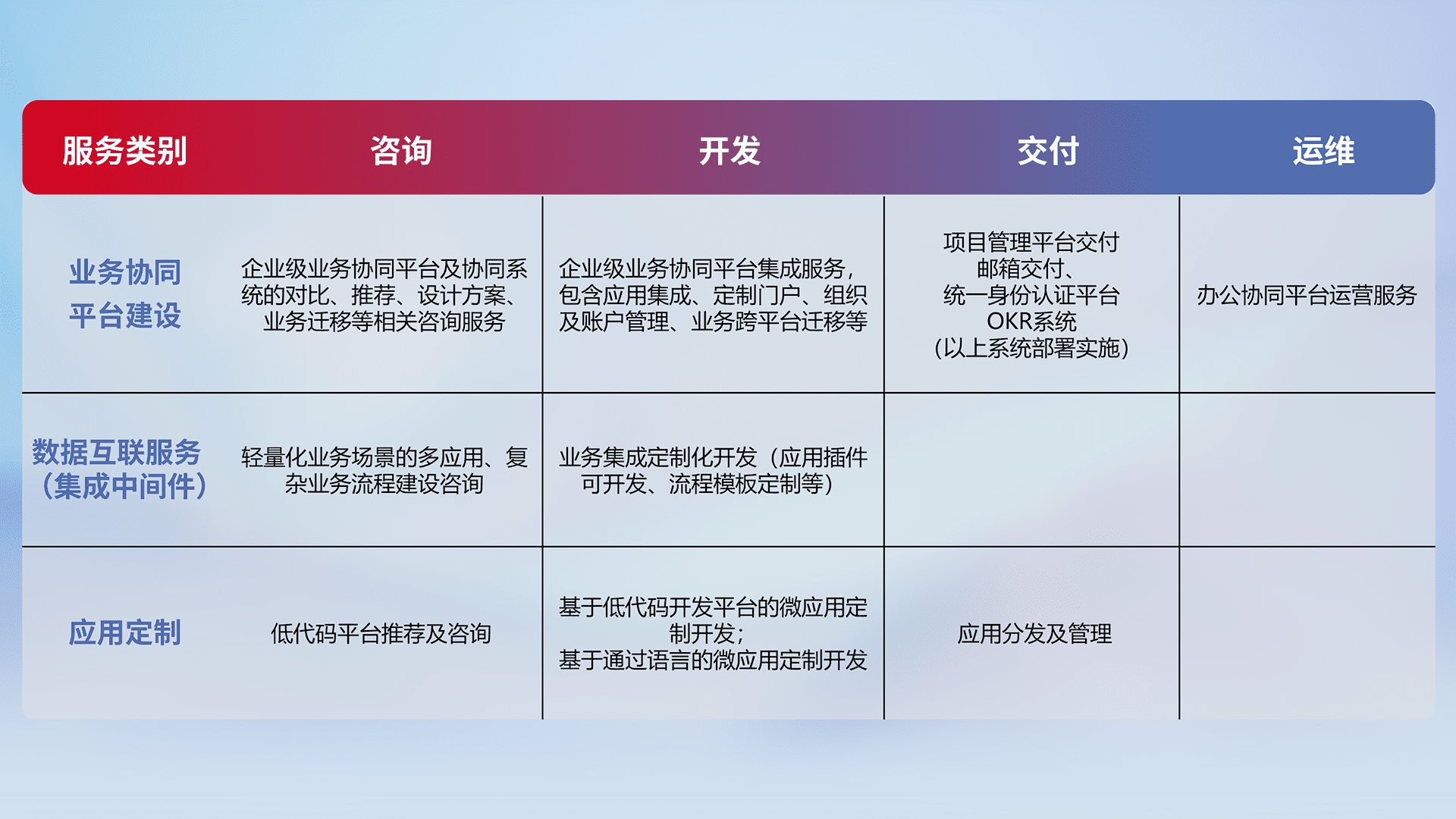 针对钉钉、、、、企微、、、IDaas等平台级产品提供产品的规划、、、、方案、、、交付、、定制化开发等服务,,实现如统一协同办公、、、智能客户服务、、、、混合会议管理、、、智能数据查询、、、等业务场景,,实现数字化转型。。